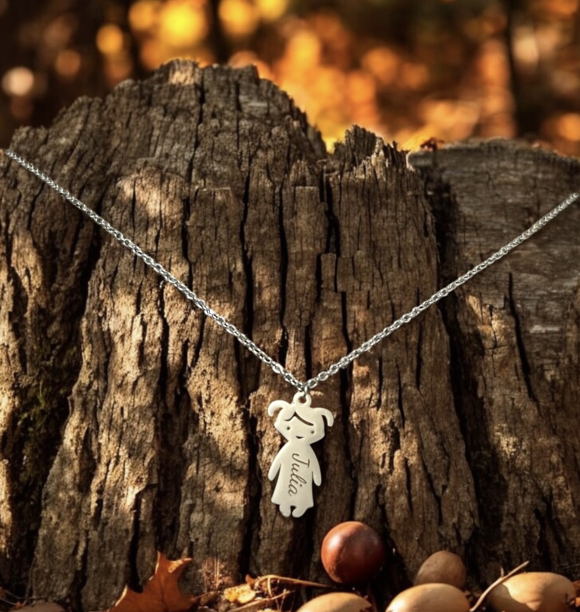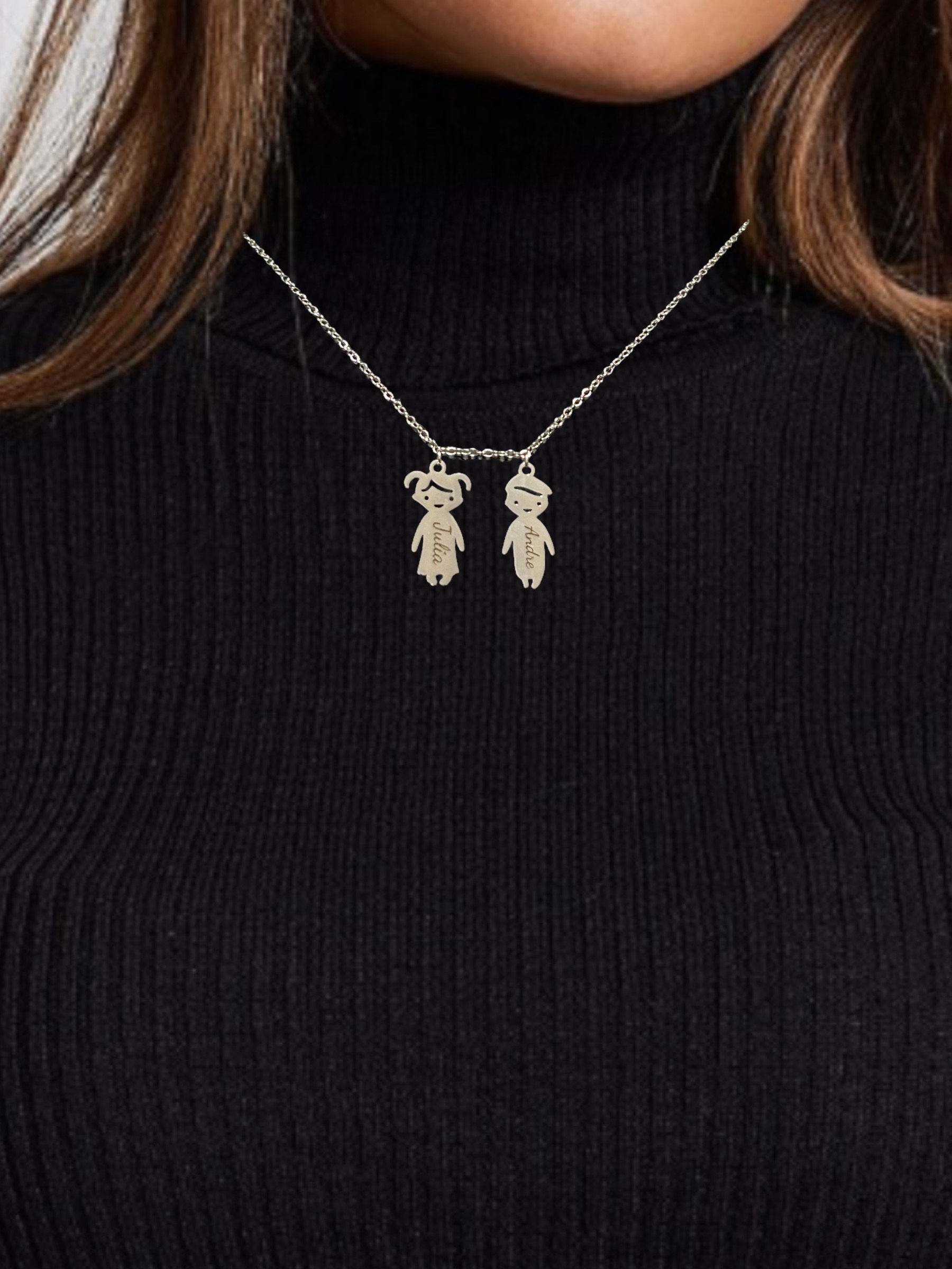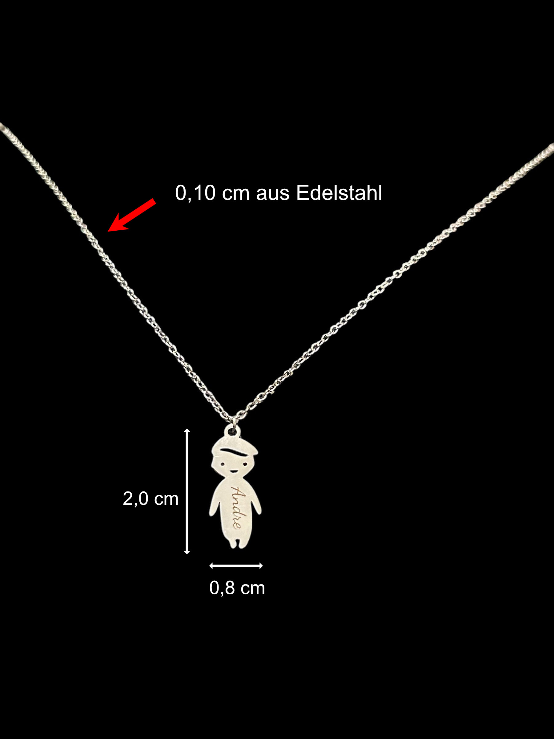 Ein Muss für jede Mutter. Eine Halskette mit dem Namen der Kinder oder Enkelkinder auf dem Anhänger aus rostfreiem Stahl.
