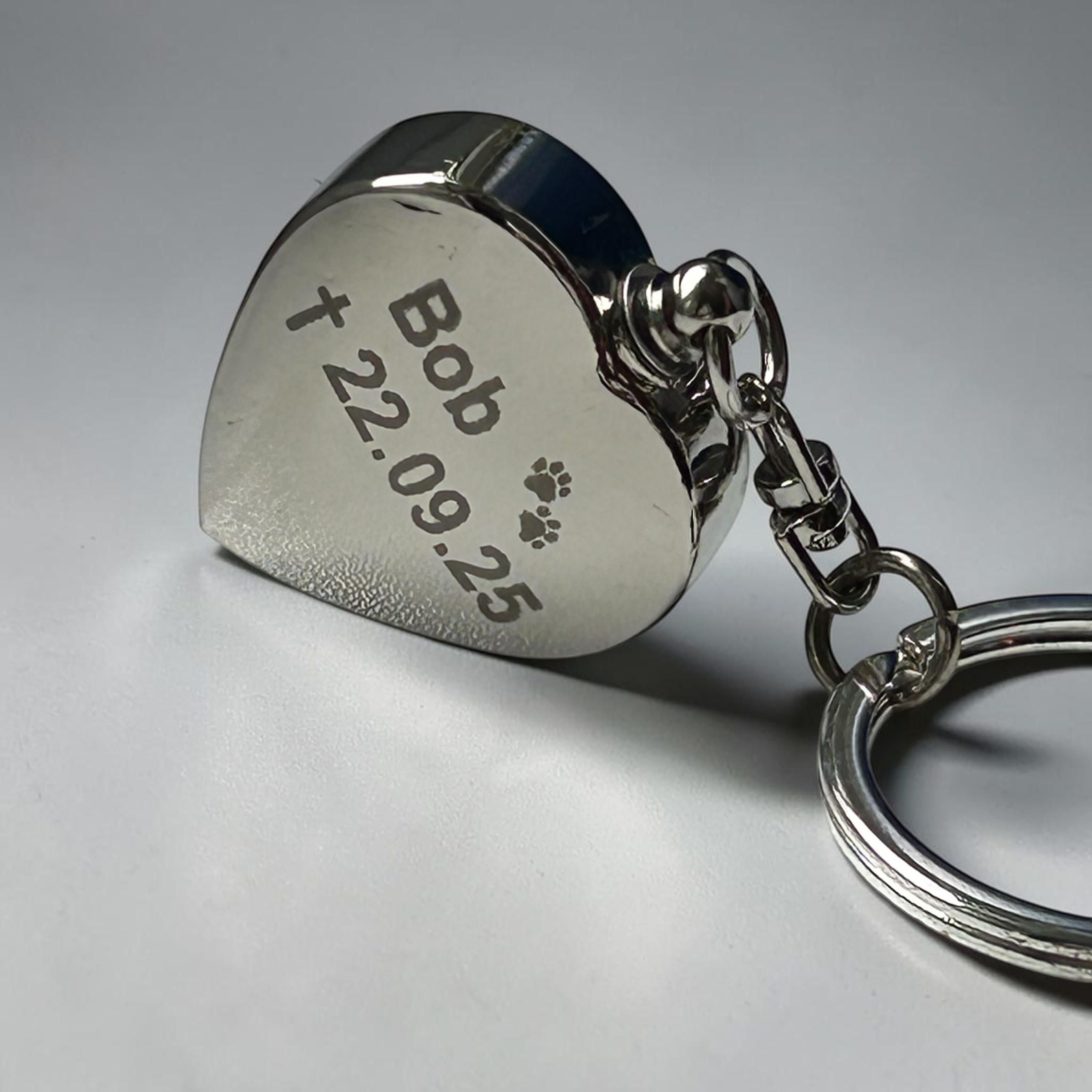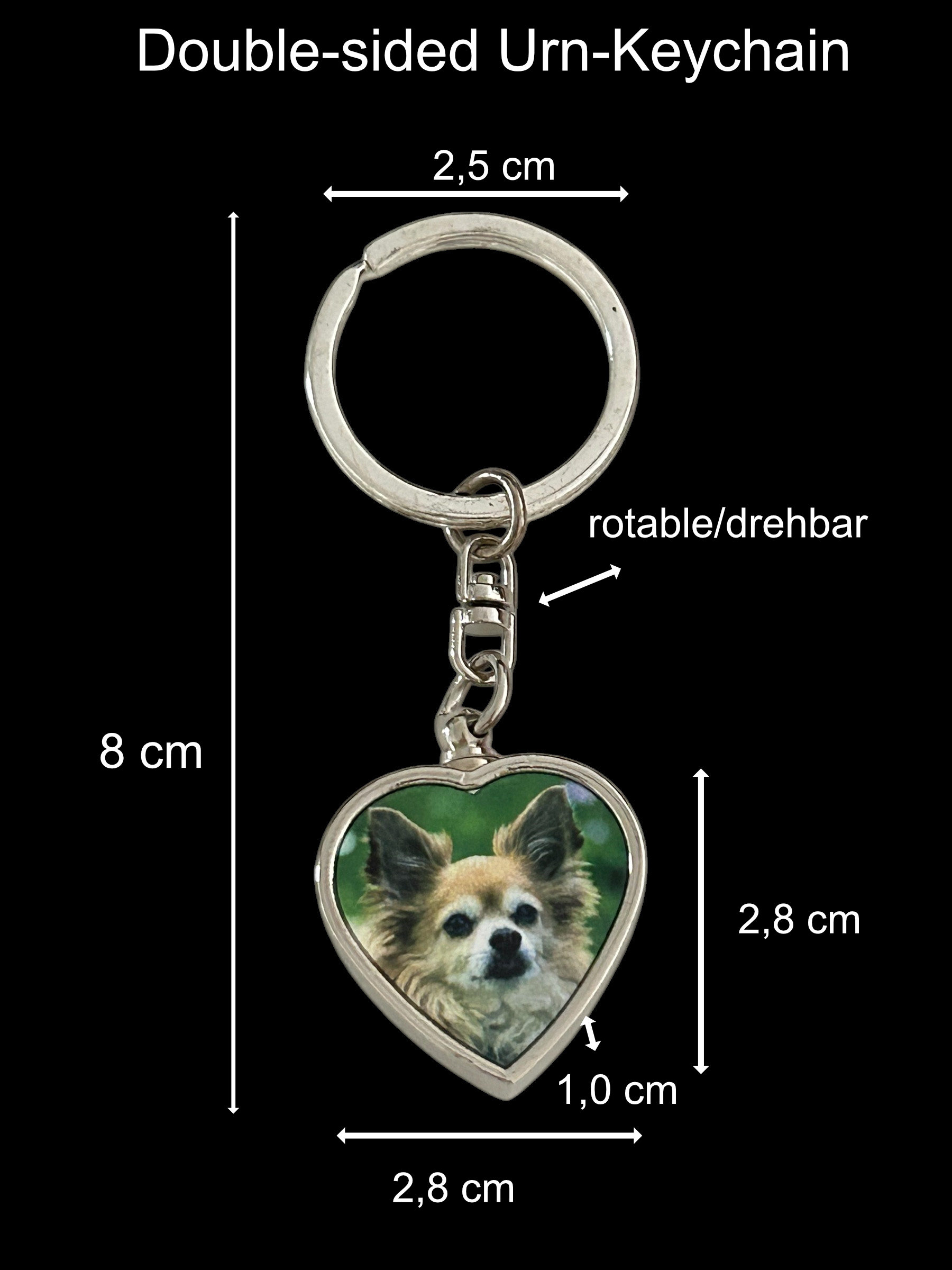 Dieser personalisierte Urnen-Foto-Schlüsselanhänger ist beidseitig gestaltet: Auf der Vorderseite befindet sich das Bild, auf der Rückseite Ihre persönlichen Gravurtexte. Geeignet zur Aufbewahrung der Asche von Haustieren und Menschen.