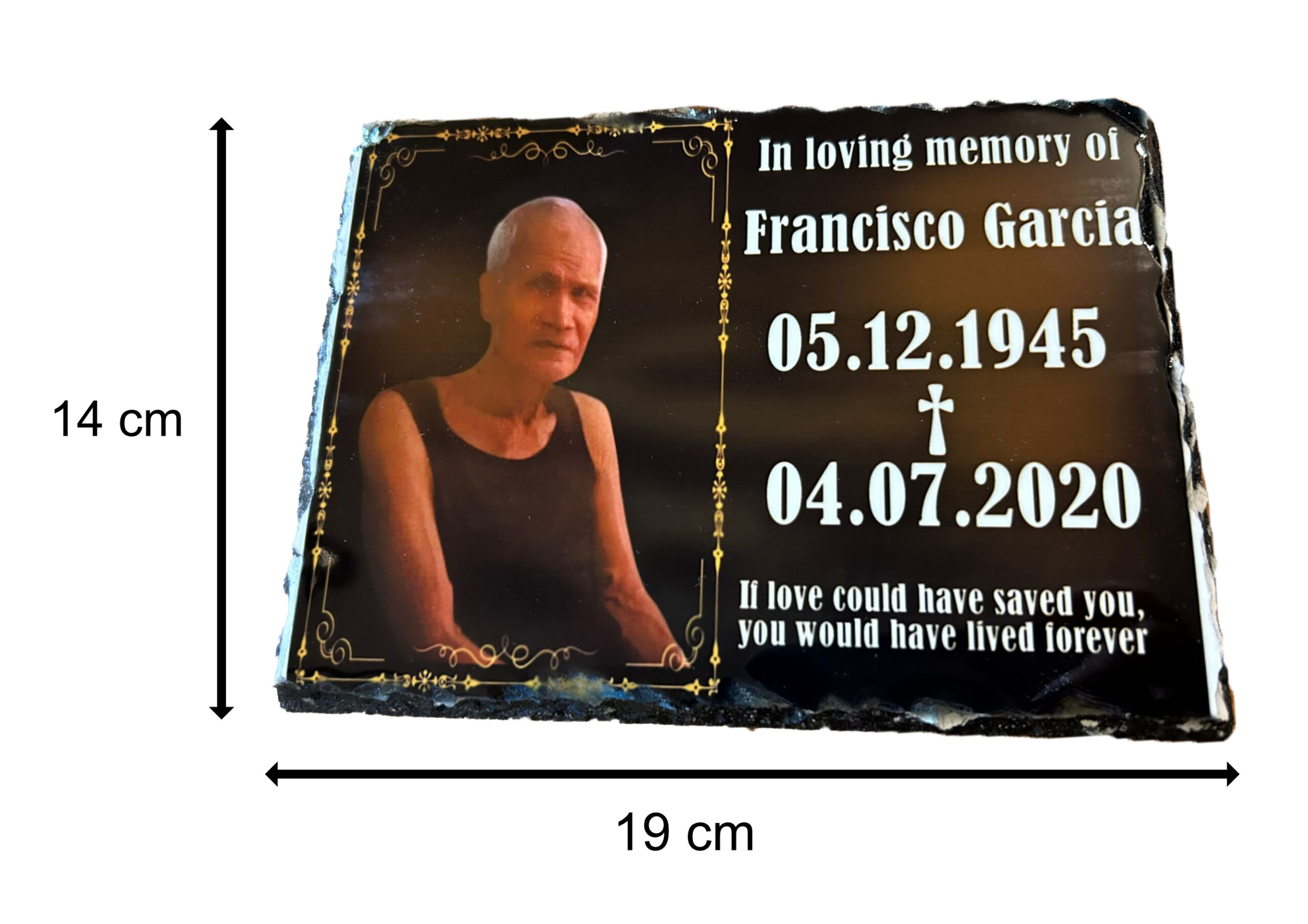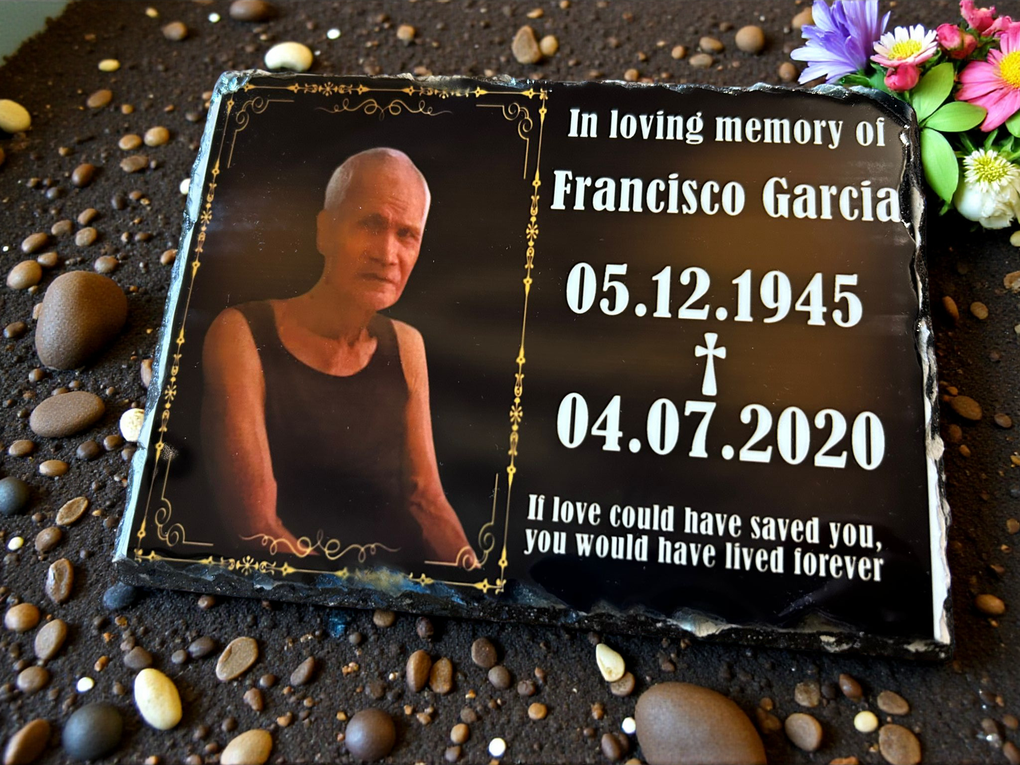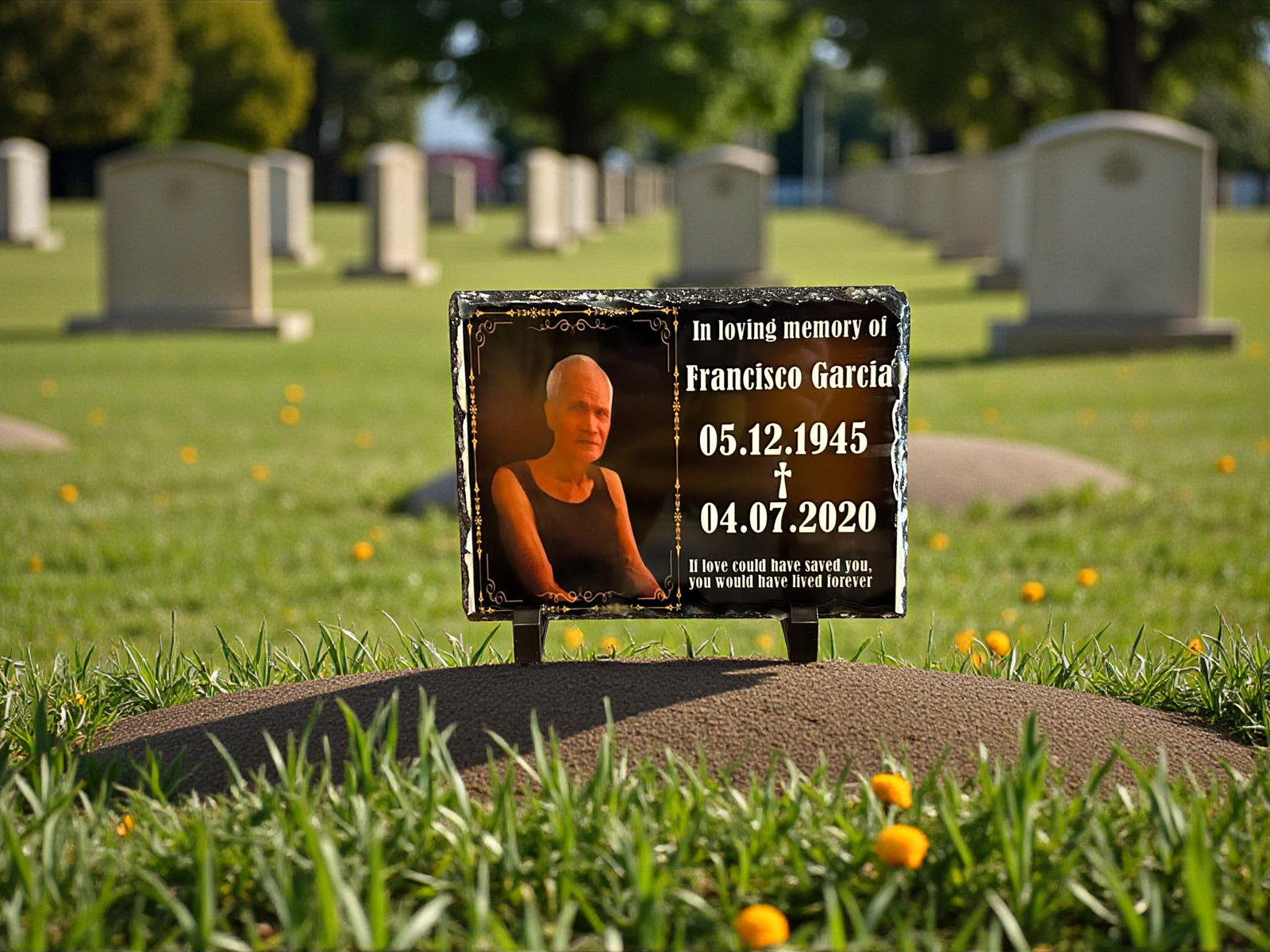 Ein wasserfester Grabfotorahmen, dessen Farben nicht verblassen. Dieser Rahmen kann mit Hilfe von zwei Kunststoffständern aufrecht aufgestellt oder flach auf das Grab gelegt werden. Er ist ein perfektes Beerdigungsgeschenk für die Familie. Sie können zwischen unseren 4 verschiedenen Rahmendesigns und 5 Schriftarten wählen.